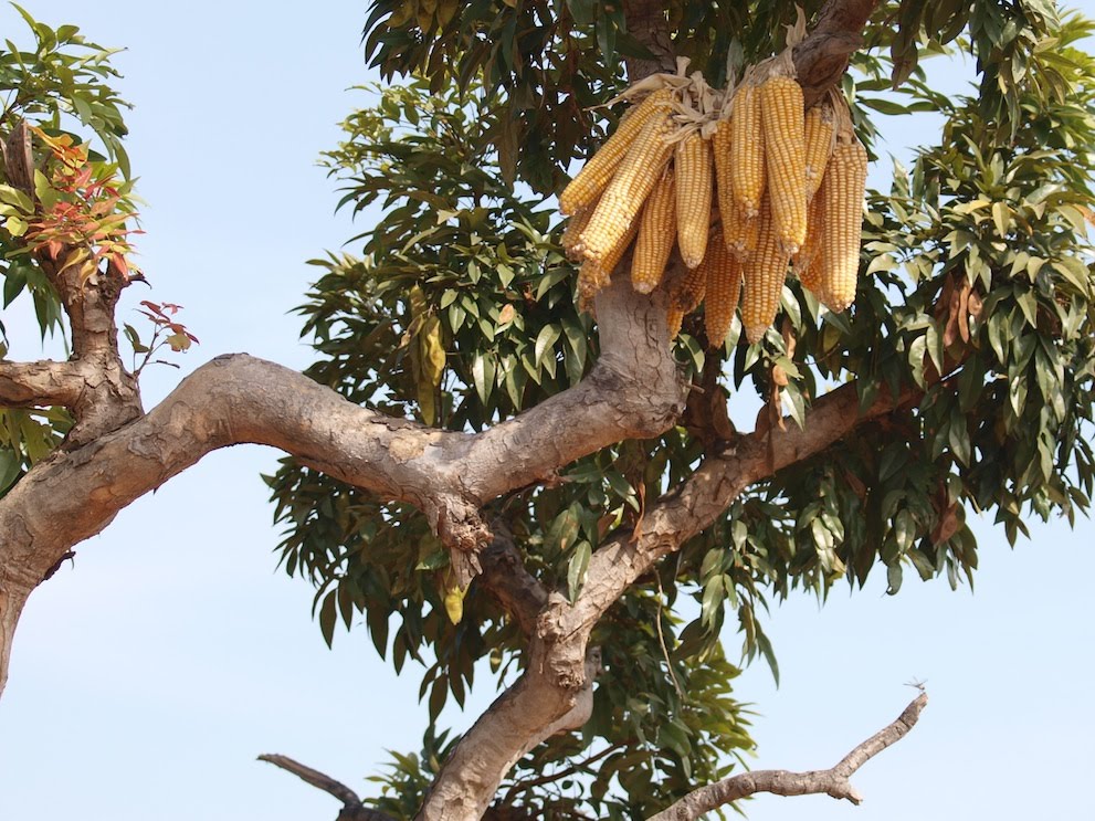 This is a hut for corn. They build mud huts with grass thatch roofs, with a small entry they close with a layer of sticks strung together. The food lasts this way for about a year, until the next harvest season.